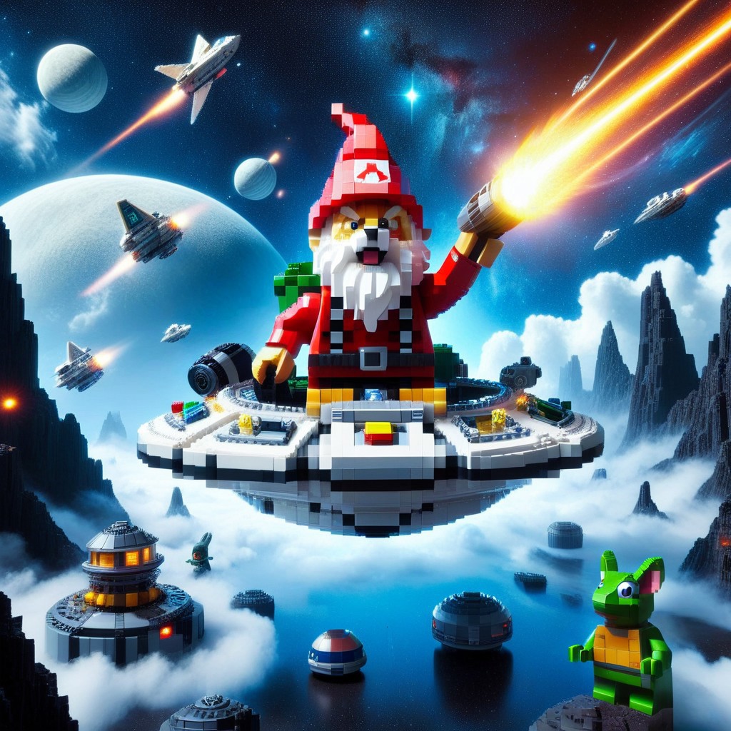 Whimsical Cartoon into Real Photo Backgrounds, Pixel Art, PixArFK, made of legos, score_9, score_8_up, score_7_up, score_6_up, score_5_up, score_4_up, masterpiece best quality, excellent countershading, detailed lighting, depth of field, dynamic angle, close up, oil painting BREAK a whimsical gnome riding a Shiba Inu flying saucer with its mouth open charging a laser beam, funny, realistic, photograph, shiny, rabbit, bear, frog, BREAK star cluster,space stars,clouds,stars,nebula,space art, deep space, cyberpunk space station, sci-fi space station, outer space, stars, planets, nebula, galaxies, the Milky Way, space station, massive space station, space shuttle, PixArFK