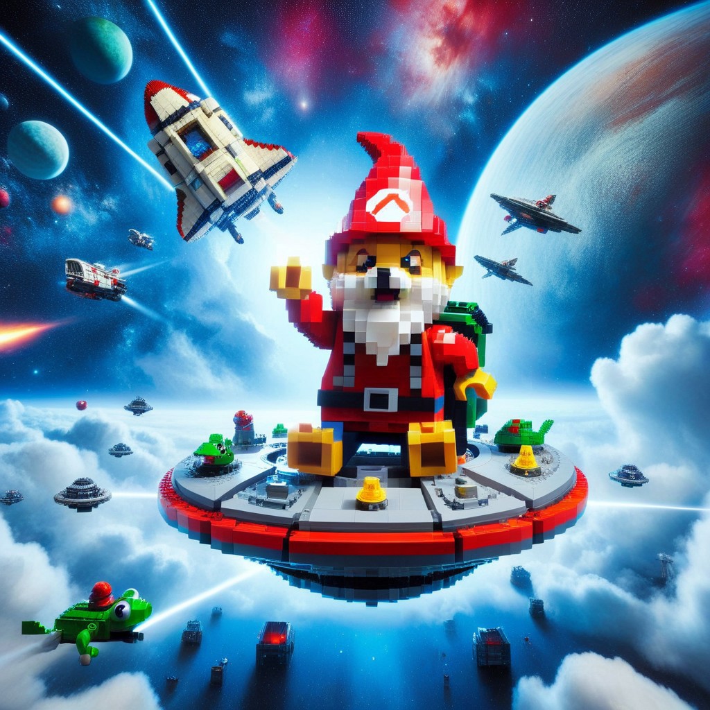 Whimsical Cartoon into Real Photo Backgrounds, Pixel Art, PixArFK, made of legos, score_9, score_8_up, score_7_up, score_6_up, score_5_up, score_4_up, masterpiece best quality, excellent countershading, detailed lighting, depth of field, dynamic angle, close up, oil painting BREAK a whimsical gnome riding a Shiba Inu flying saucer with its mouth open charging a laser beam, funny, realistic, photograph, shiny, rabbit, bear, frog, BREAK star cluster,space stars,clouds,stars,nebula,space art, deep space, cyberpunk space station, sci-fi space station, outer space, stars, planets, nebula, galaxies, the Milky Way, space station, massive space station, space shuttle, PixArFK
