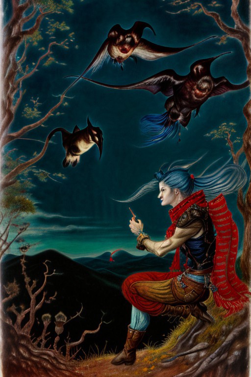 (looking at viewer:0.9), score_9, score_8, score_7, score_8_up, score_7_up, score_6_up, Romani girl, ((long blue hair)), hair tied back, dark skin, almond-shaped eyes, brown tunic, red scarf, blue vest, forest green pants, tall leather boots, gauntlets, wielding a quarterstaff, overlooking a vast fantasy valley, birds flying by, strange creatures down below. masterpiece, high resolution, midshot,