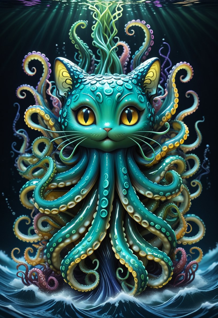 cs-l3ath3r, octocat, a mythical creature with the head of a cat and the body of an octopus, (cat head:1,6), whiskers, (cat ears:1.5), (inner fluff ears:1.3), (cat eyes:1.5), tentacles, eight tentacles, twisting tentacles, swirling tentacles, dark background, deep sea background, directed light, spotlight, best_quality, masterpiece, absurdres, highres, subject_focus, depth_of_field, ultra_detailed, sharp_focus, high_detail, intricate detail, clean_lines, volumetric lighting, dynamic shot, patterns, intricate weavings, rich colors, liquid smoke wrapping the tentacles,