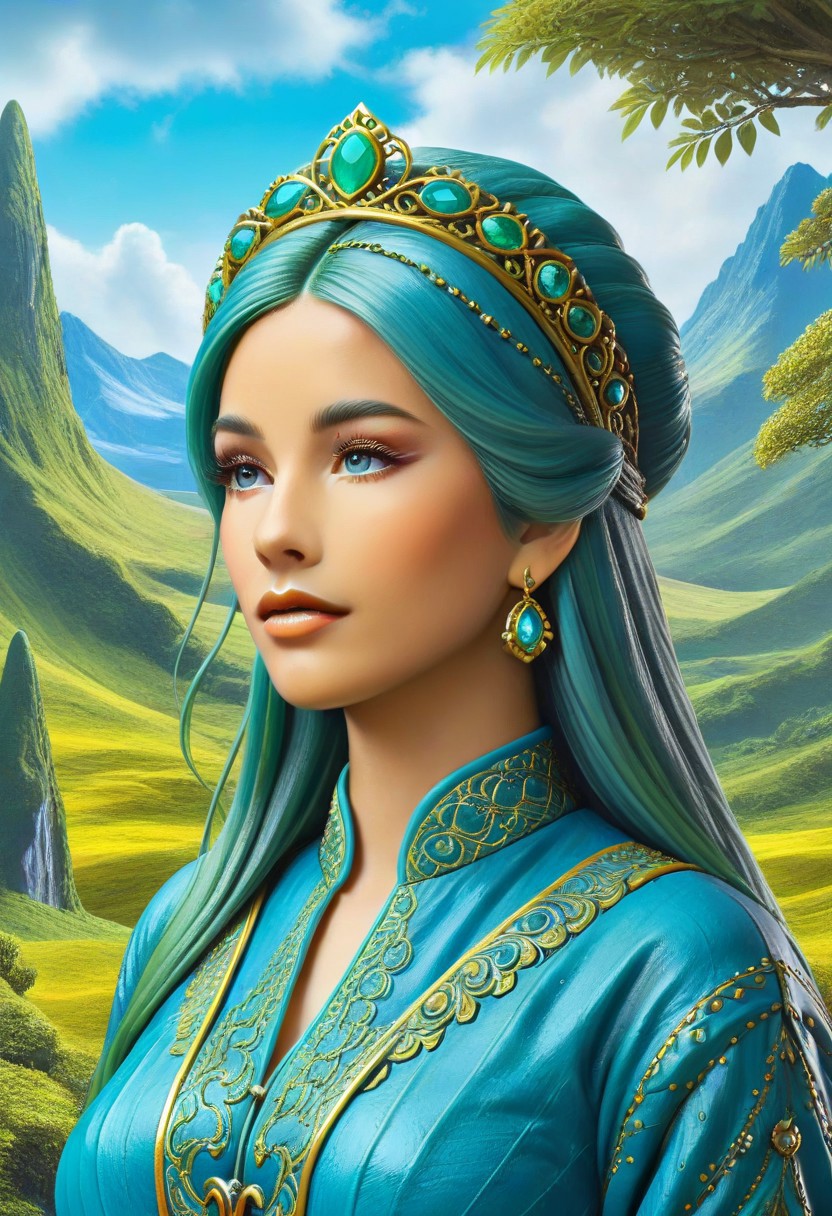 Queen made of dvr-pckl, magical landscape with enchanted elements, fantasy art style, slate blue theme, intricate details, ultra sharp, exquisite detail, flawless composition, vivid colors, masterpiece, Super model, portrait, stoic, expressionless, beautiful, photorealistic, UHD, 8K, masterpiece, detailed, ultra_high_resolution, lots of detail, YurYuna, modest, sfw, gorgeous, looks beautiful and aesthetic, colorful background, key visual, luxurious, artistic, high resolution, digital art, visual aesthetics, contemporary design, vibrant colors, artistic composition, elegant, intricate detailing, modern,
