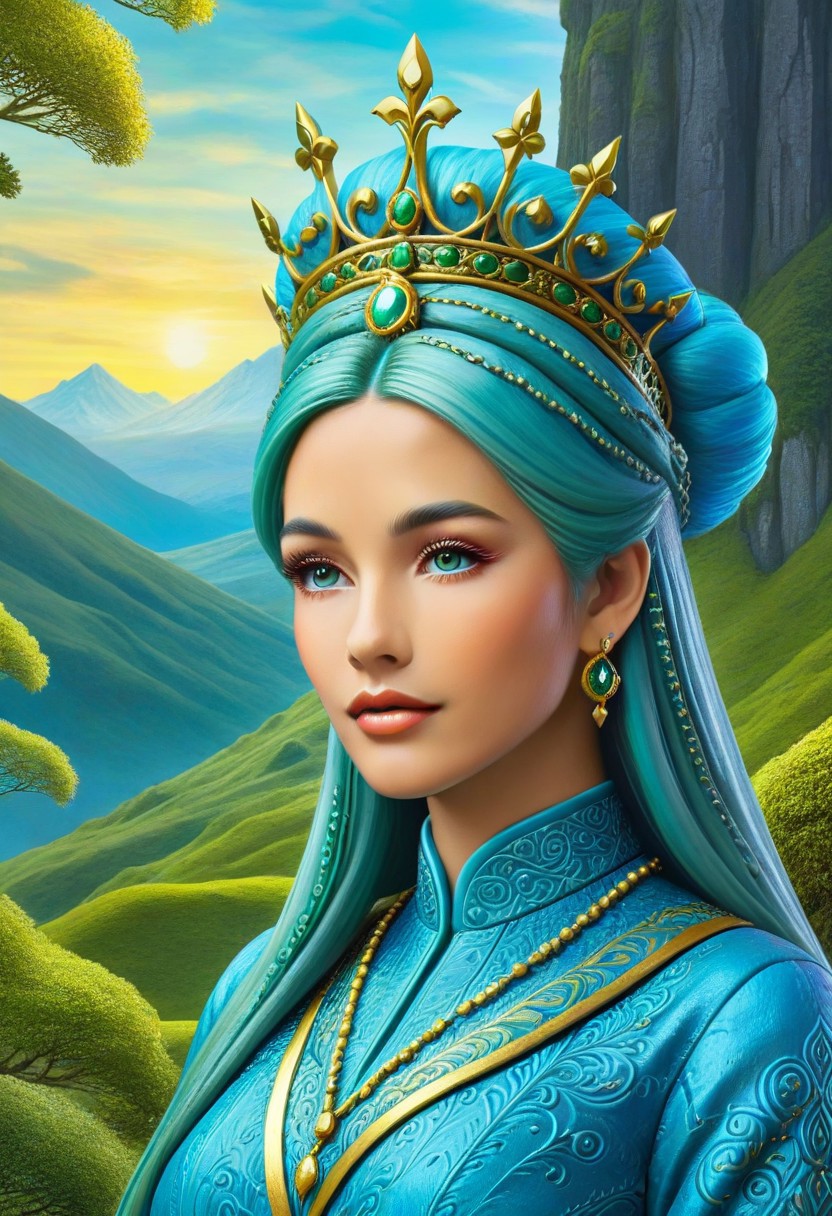 portrait,Queen made of dvr-pckl, magical landscape with enchanted elements, fantasy art style, slate blue theme, intricate details, ultra sharp, exquisite detail, flawless composition, vivid colors, masterpiece, Super model, portrait, stoic, expressionless, beautiful, photorealistic, UHD, 8K, masterpiece, detailed, ultra_high_resolution, lots of detail, YurYuna, modest, sfw, gorgeous, looks beautiful and aesthetic, colorful background, key visual, luxurious, artistic, high resolution, digital art, visual aesthetics, contemporary design, vibrant colors, artistic composition, elegant, intricate detailing, modern,