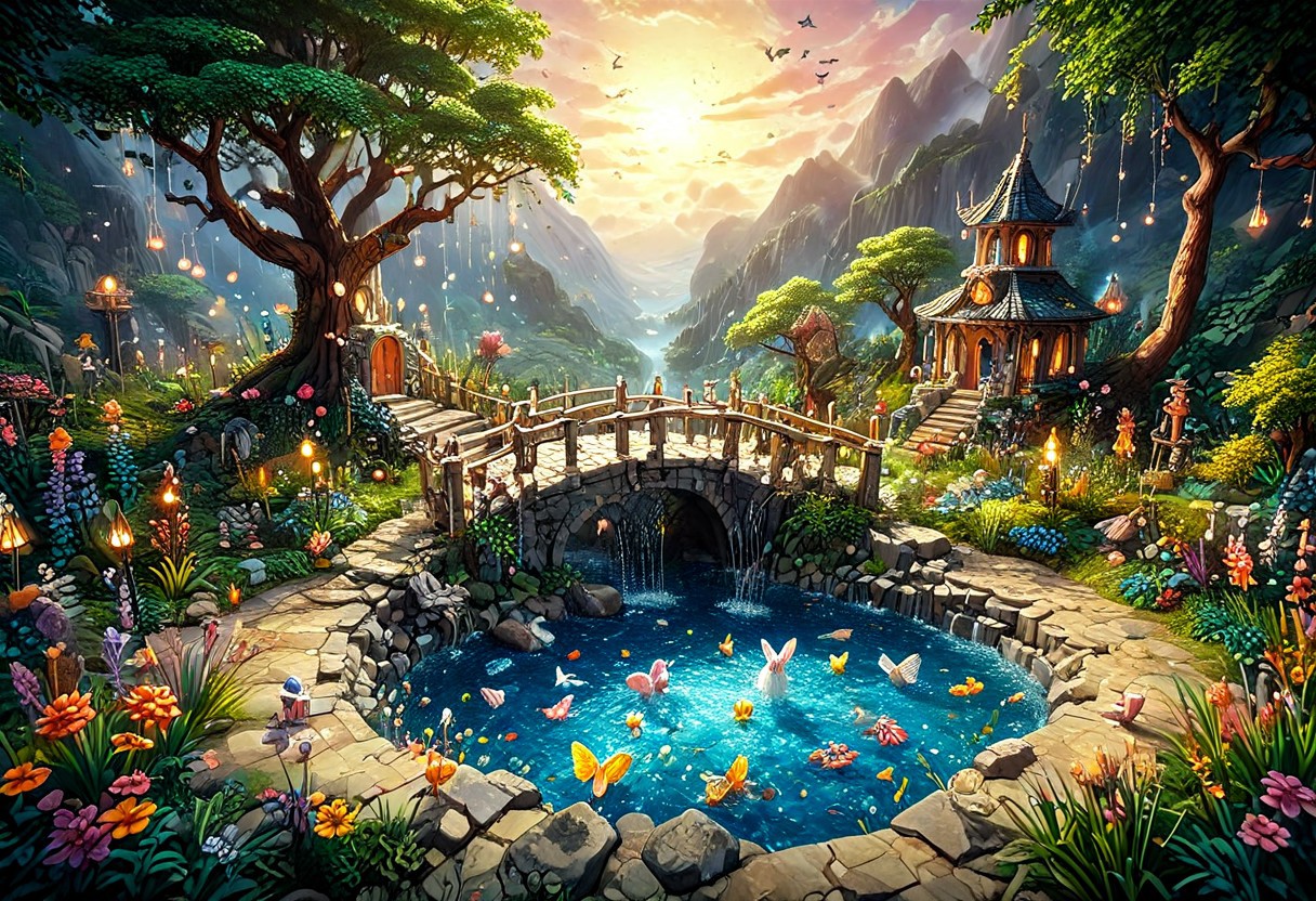 score_9, score_8_up, score_7_up, score_6_up, Masterpiece, source_anime screenshot, 1 girl, vivid colors, full color, shiny and glossy, anime style, high-res, beautiful aesthetic, very intricate, high-quality details, vibrant, highly detailed, award-winning, professional,(Isekai anime style.Anime coloring.(0.9))In a whimsical world, a beautiful fairy garden blooms with vibrant flowers and sparkling fountains. A delicate, crystal bridge spans a gentle stream, leading to a majestic tree with leaves that shimmer like diamonds. A friendly, fluffy rabbit hops along the winding path, surrounded by fluttering butterflies and sweet, singing birds. The garden is filled with hidden treasures, like a tiny, glowing fairy door and a secret, shimmering cave. A soft, fluffy cloud drifts lazily across the sky, casting a warm, gentle shadow over the garden. The air is filled with the sweet scent of blooming flowers and the soft, soothing sound of gentle chimes. It's a peaceful, magical place where dreams come alive and wonder waits around every corner.master_class,master_piece,up_8,up_9,perfect beautiful,perfect beautiful early morning light.