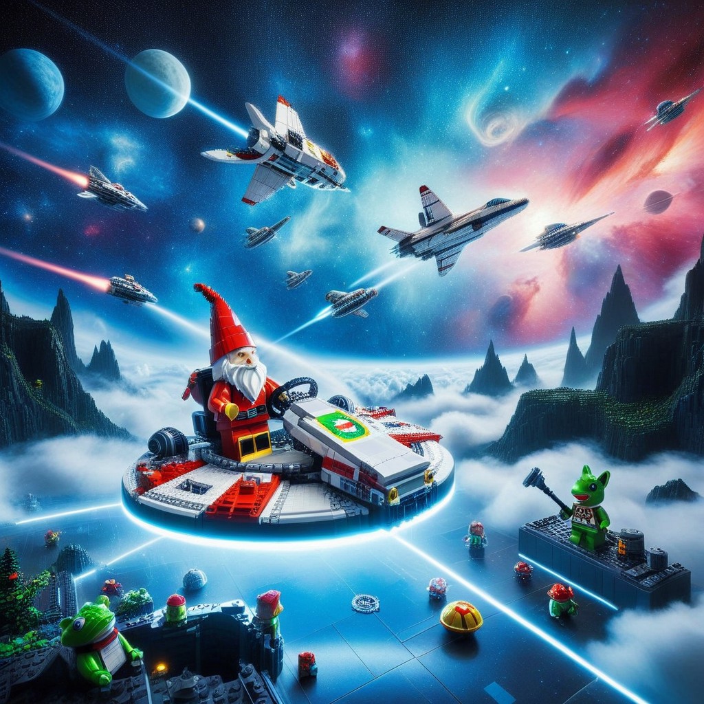 Whimsical Cartoon into Real Photo Backgrounds, Pixel Art, PixArFK, made of legos, score_9, score_8_up, score_7_up, score_6_up, score_5_up, score_4_up, masterpiece best quality, excellent countershading, detailed lighting, depth of field, dynamic angle, close up, oil painting BREAK a whimsical gnome riding a Shiba Inu flying saucer with its mouth open charging a laser beam, funny, realistic, photograph, shiny, rabbit, bear, frog, BREAK star cluster,space stars,clouds,stars,nebula,space art, deep space, cyberpunk space station, sci-fi space station, outer space, stars, planets, nebula, galaxies, the Milky Way, space station, massive space station, space shuttle, PixArFK