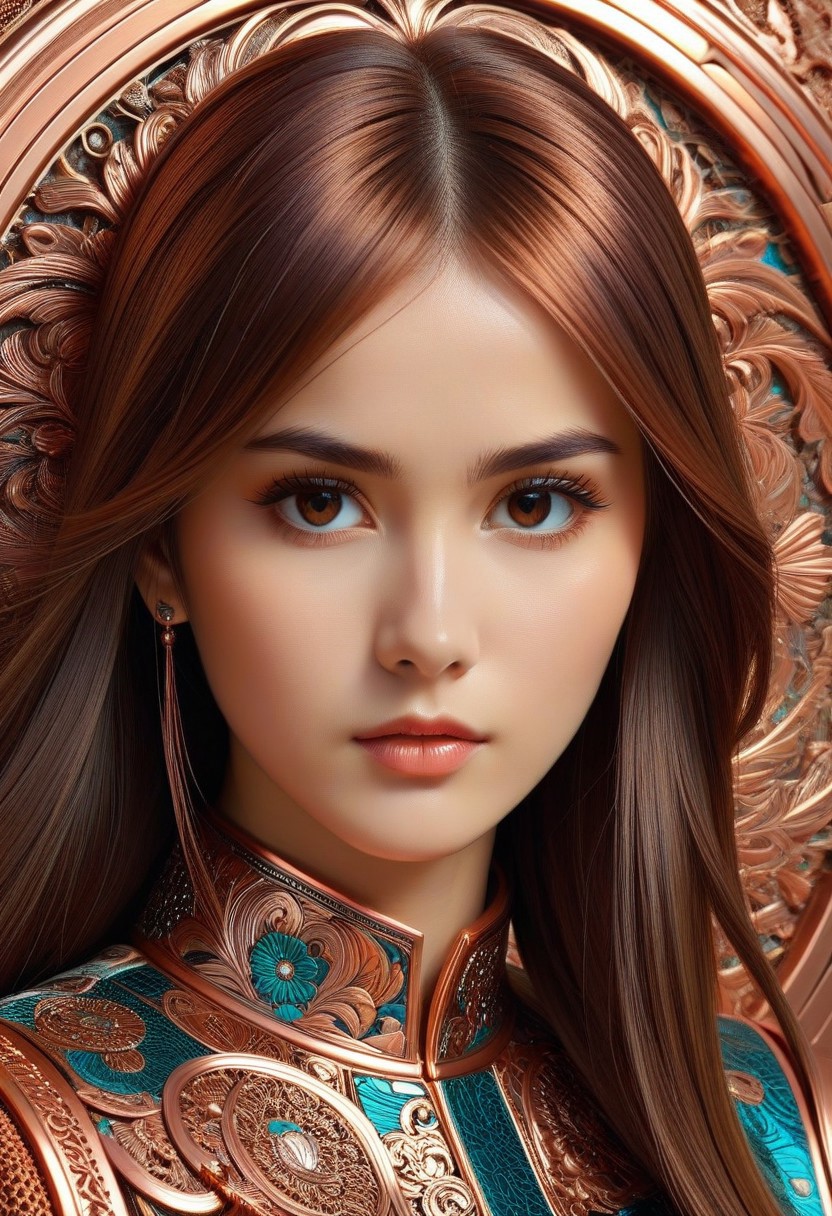 CopperCopper theme, intricate details, ultra sharp, exquisite detail, flawless composition, vivid colors, masterpiece, Super model, portrait, stoic, expressionless, beautiful, photorealistic, UHD, 8K, masterpiece, detailed, ultra_high_resolution, lots of detail, YurYuna, brown hair, modest, sfw, gorgeous, looks beautiful and aesthetic, colorful background, key visual, luxurious, artistic, high resolution, digital art, visual aesthetics, contemporary design, vibrant colors, artistic composition, elegant, intricate detailing, modern,