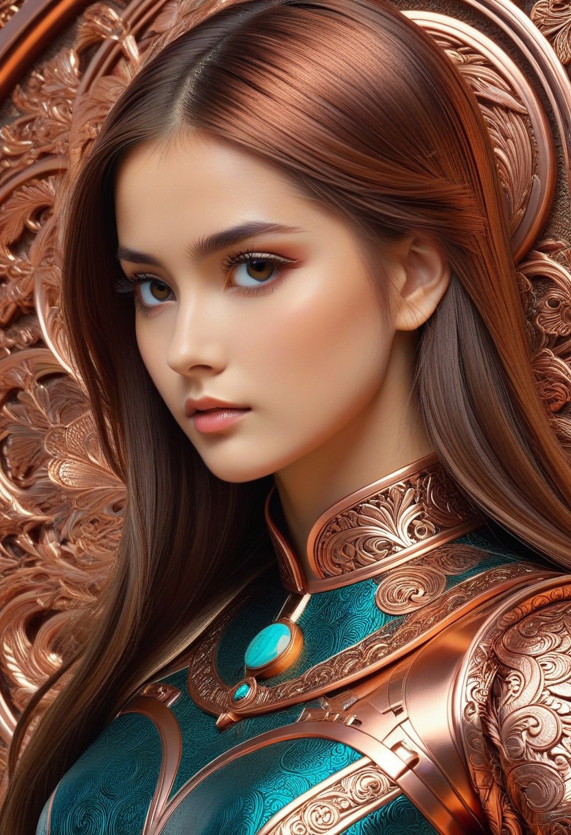 CopperCopper theme, intricate details, ultra sharp, exquisite detail, flawless composition, vivid colors, masterpiece, Super model, portrait, stoic, expressionless, beautiful, photorealistic, UHD, 8K, masterpiece, detailed, ultra_high_resolution, lots of detail, YurYuna, brown hair, modest, sfw, gorgeous, looks beautiful and aesthetic, colorful background, key visual, luxurious, artistic, high resolution, digital art, visual aesthetics, contemporary design, vibrant colors, artistic composition, elegant, intricate detailing, modern,
