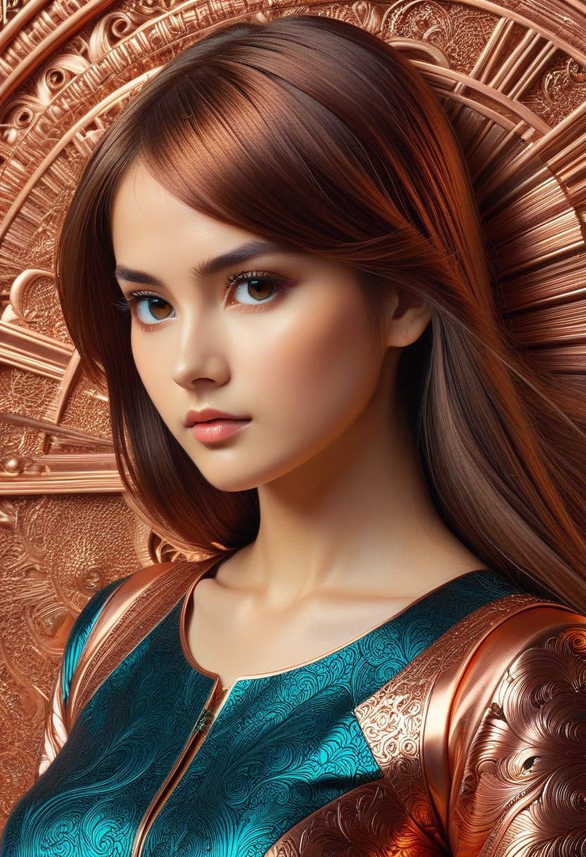CopperCopper theme, intricate details, ultra sharp, exquisite detail, flawless composition, vivid colors, masterpiece, Super model, portrait, stoic, expressionless, beautiful, photorealistic, UHD, 8K, masterpiece, detailed, ultra_high_resolution, lots of detail, YurYuna, brown hair, modest, sfw, gorgeous, looks beautiful and aesthetic, colorful background, key visual, luxurious, artistic, high resolution, digital art, visual aesthetics, contemporary design, vibrant colors, artistic composition, elegant, intricate detailing, modern,