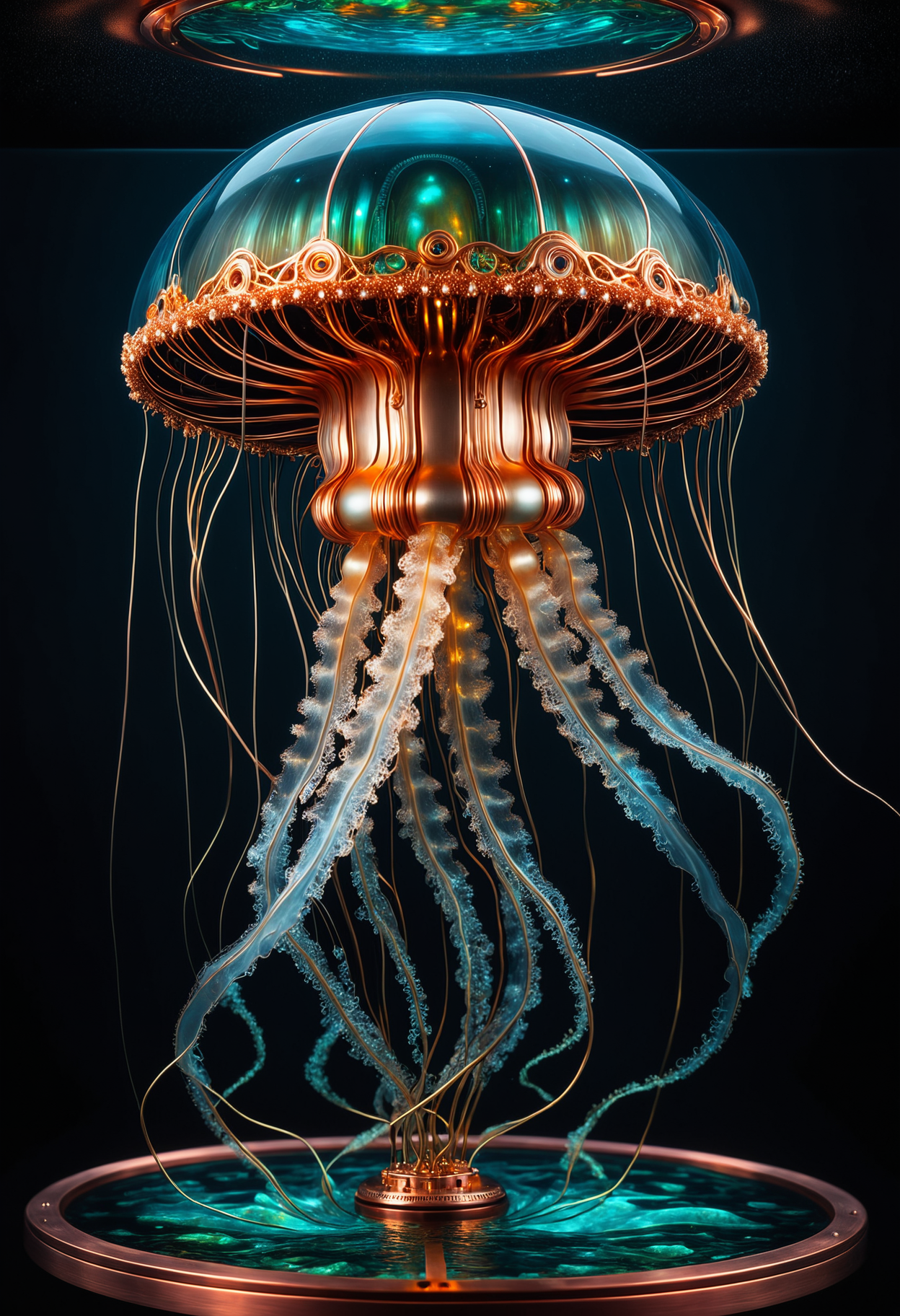 (masterpiece, best quality, ultra-detailed), a biomechanical jellyfish floating in the abyss of the deep ocean, its body is a complex structure of polished CopperCopper and translucent glowing glass, revealing intricate clockwork mechanisms inside. Surrounded by ethereal bioluminescent plankton, ultra-realistic water textures, volumetric light, deep blue and orange colors, cinematic lighting, surrealism.
