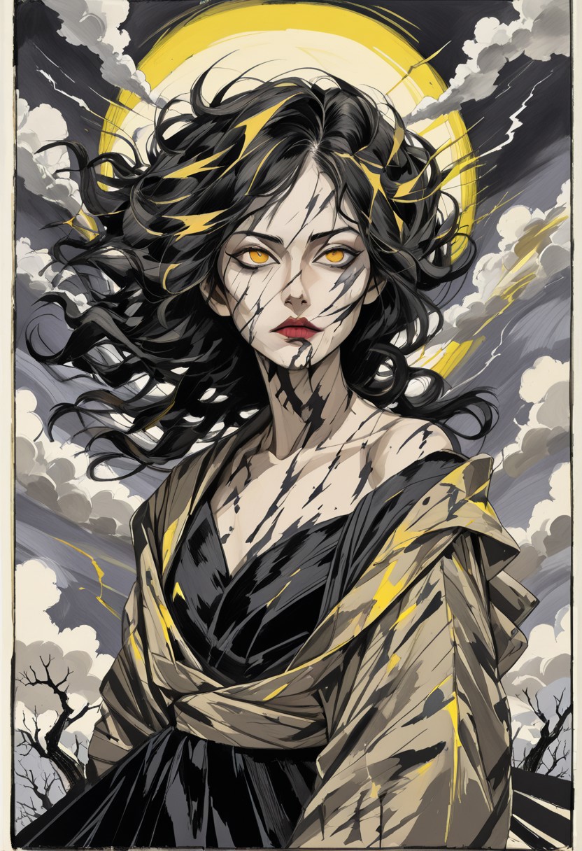 painterly coal, breathtaking detailed, masterpiece, absurdres, awe-inspiring, best quality, vibrant colors, expressionist portrait of a middle agewoman (tomie kawakami) beneath stormy skies, textured like charcoal sketch and oil paint, her dark dress partially transparent, revealing surreal (charcoal outline) of lightning and wind‑blown trees across her shoulders, her pale skin marked with subtle (color burst) contrasts in slate black and ochre, background dissolves into a blurred tempest with [visual fragmentation] of cloud swirls and debris, expressive brush strokes forming her outfit and hair caught in motion, dramatic lighting illuminating one side of her face and scattering shadows, abstract composition merging her form with the chaotic sky, [charcoal and paint textures] bleeding into one another, painterly transitions between sky, skin and cloth, high contrast rendering,