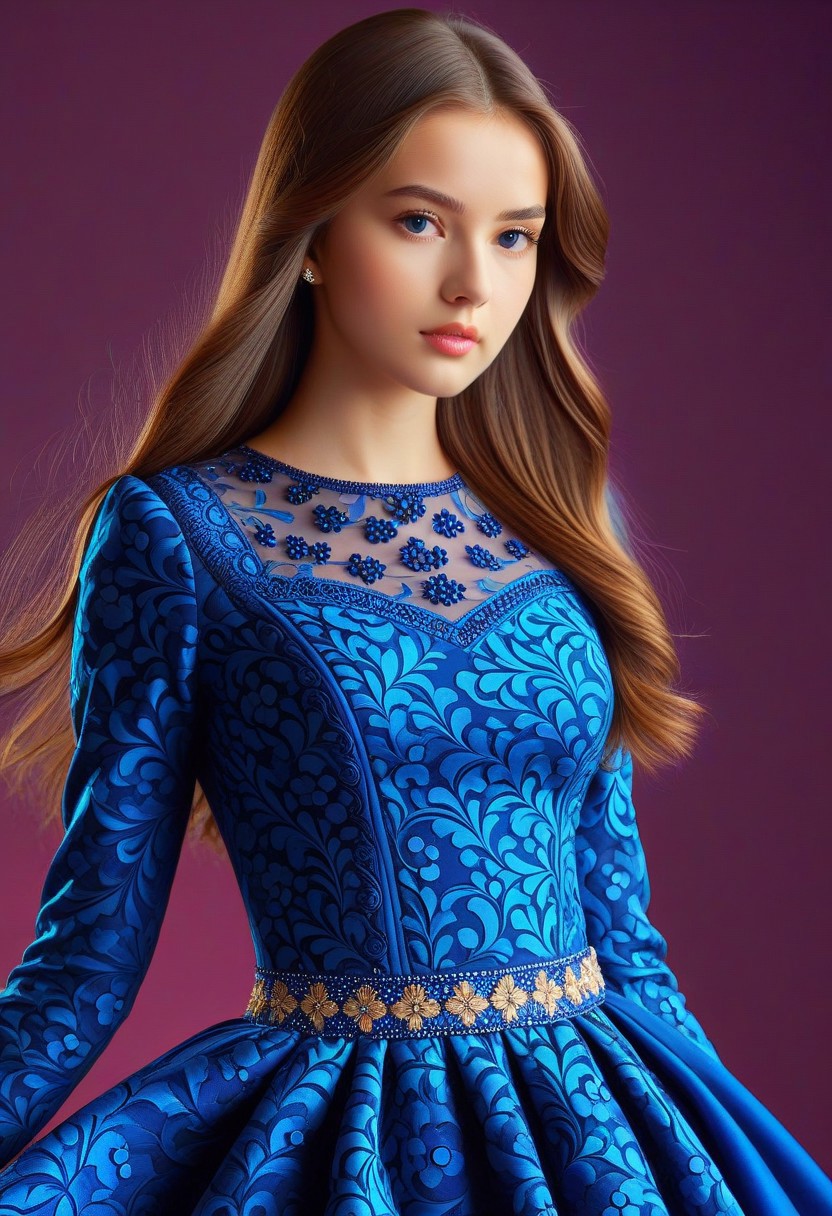 blueberrym0rph, blueberry dress, intricate details, ultra sharp, exquisite detail, flawless composition, vivid colors, masterpiece, Super model, portrait, stoic, expressionless, beautiful, photorealistic, UHD, 8K, masterpiece, detailed, ultra_high_resolution, lots of detail, YurYuna, brown hair, modest, sfw, gorgeous, looks beautiful and aesthetic, colorful background, key visual, luxurious, artistic, high resolution, digital art, visual aesthetics, contemporary design, vibrant colors, artistic composition, elegant, intricate detailing, modern,