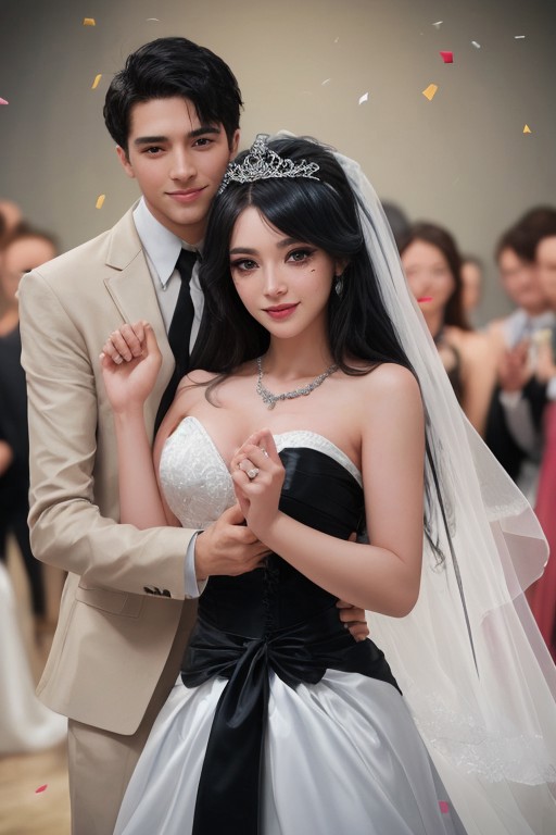 Ultra High Definition, Impeccable Detail, Premier Quality, Best-in-class, (Photorealistic), (Lifelike), Top quality, score_9, score_8_up, score_7_up, score_6_up, score_5_up, score_4_up, (perfect anatomy), Smooth Anime Night, Expressiveh, realistic skin, detailed skin, detailed skin pore, skin texture style, amateur, raw photo, BREAK, 1girl, JaneXL, black hair, long straight hair, blue eyes, detailed eyes, blue eyeshadow, wearing Black queen of spades necklace, eyelashes, slim, perfect breasts, curvaceous body, hourglass figure, shiny skin, dimples, body freckles, (hyperdetailed skin), flared lashes, eyeliner, mascara, wedding ring, blue diamond earrings, BREAK, wearing wedding dress, short sleeveless, shawl, wedding veil, tiara, BREAK, 1Man, husband, couple photo, Man wearing black tuxedo face out of frame, wedding, blush, romantic, wedding photo, front view, standing, looking at viewer, hetero, straight couple, smile, face out of frame, arm around waist, head tilt, waving hello, BREAK, in wedding hall, wedding banner, crowd, confetti, perfect shadows, Cinematic, film grain, depth of field, (volumetric light source,), (sound effects,),