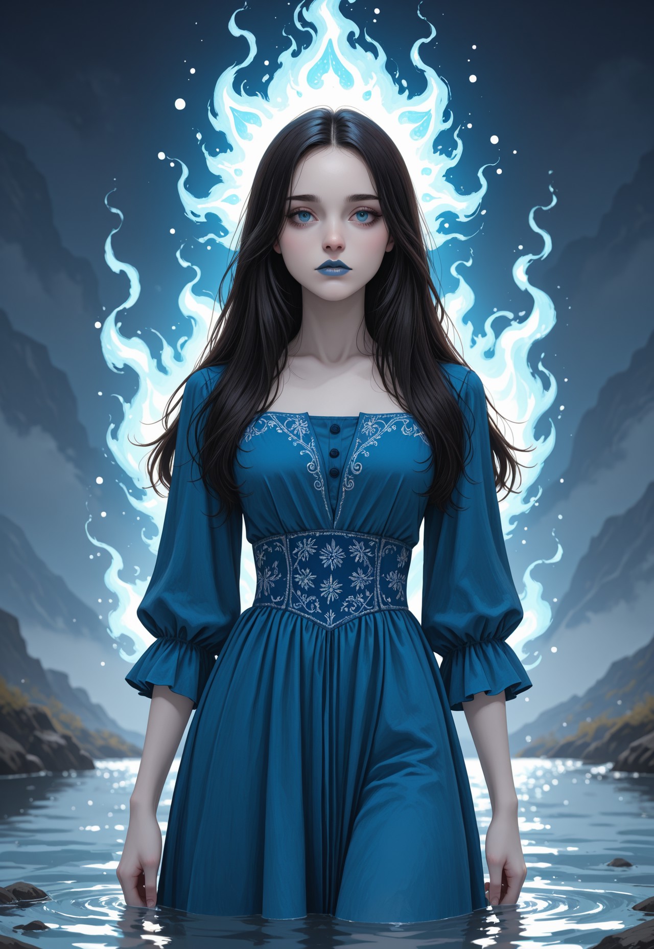 A solo Slavic Water Spirit. Dark hair. Pale skin. Blue eyes. Thin eyebrows. Small nose. Blue lips. Wears blue dress. Stands in water. (1Slavic Water Spirit, blue dress) ((half body view)), (((cowboy_shot)))