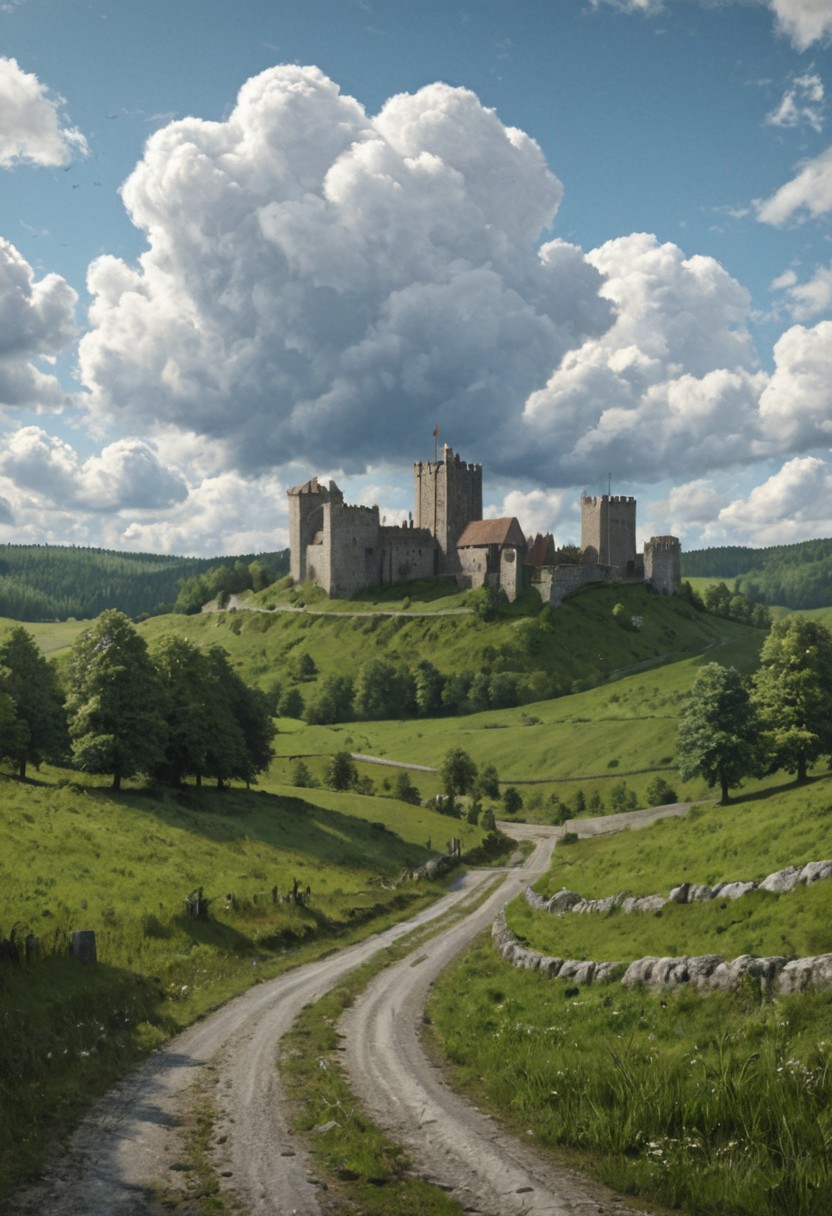 A realistic medieval germanic landscape, showing a stone castle, with medieval Germanic Gothic-Romanesque architectural style, roads that follow the natural terrain. The surrounding countryside has green fields, scattered trees, dense woods. The sky is clear with soft blue tones and large white cumulus clouds. Natural lighting, cinematic perspective, wide view, high detail, realistic medieval textures, no fantasy elements, clear separation between buildings and landscape, logical layout, geographically consistent, perspective aligned <lora:MedievalMemories_v1:1.0> <lora:DetailTweakerXL_v1:3.0>