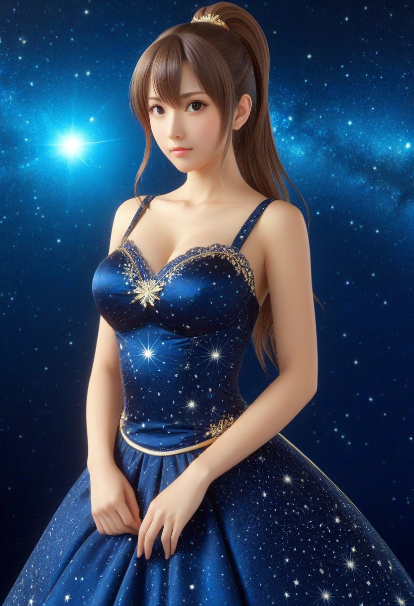 <lora:Starry_Morph:1> starry_morph, woman, (anime, masterpiece, intricate:1.3), (best quality, hires textures, high detail:1.2), (4k),(incredibly detailed:1.4),UHD, 8K, ultra detailed, beautiful dress, Super model, beautiful, UHD, 8K, masterpiece, detailed, ultra_high_resolution, lots of detail, YurYuna, brown hair, ponytail,brown hair, modest, sfw, beautiful gorgeous, key visual, luxurious, artistic, natural elements, opulence, high resolution, digital art, visual aesthetics, contemporary design, vibrant colors, reflective surfaces, artistic composition, high contrast, elegant, intricate detailing,