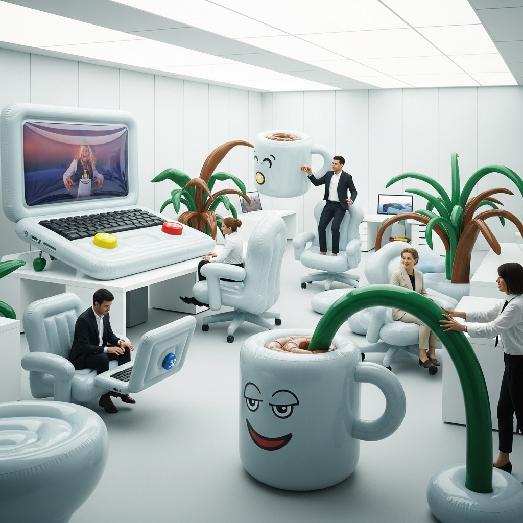 A modern high-tech office where everything is inflated: balloon-like laptops, floaty ergonomic chairs, air-puffed coffee mugs, desk plants made of bendy rubber. Bright interior lighting reflects on soft materials. Employees interacting with bounce-ready furniture in playful, surreal realism. ZyloO Style/XL inflatable design mood.