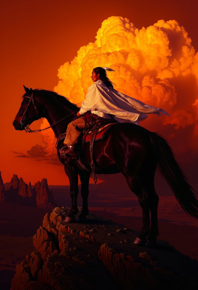 a painting in the style of mark maggiori of a Native Indian woman wearing white traditional clothing with intricate beadwork and a feathered headdress, riding a black horse with a flowing mane on a rugged, rocky cliff, crimson sky with dark yellow clouds streaked across it, wind blowing her clothing and the horse’s tail, distant mountains and jagged rocks in the background, dramatic lighting casting deep shadows, intense and powerful atmosphere