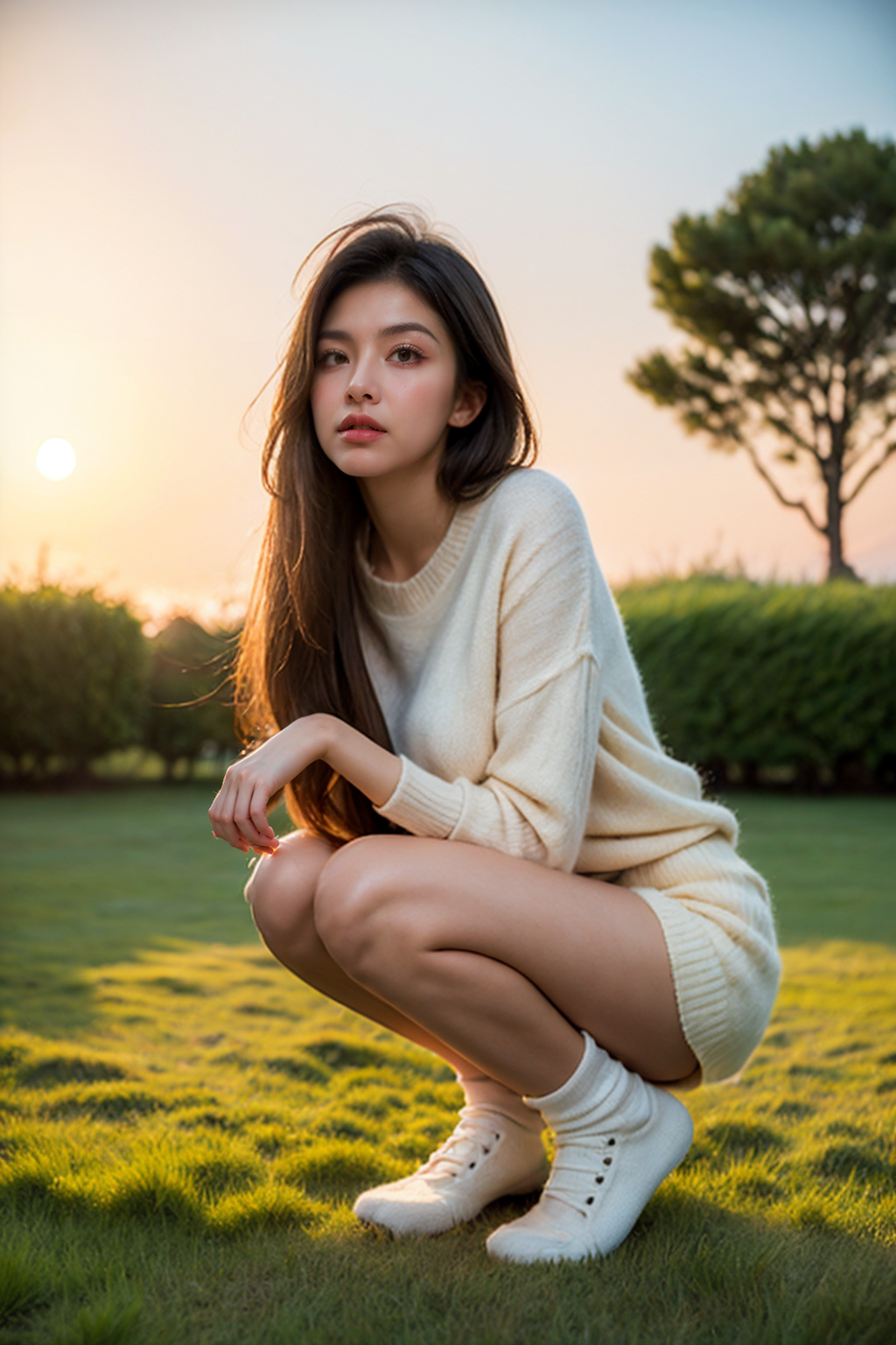 (Soft Lighting Photography by Mimoza Veliu and Mario Giacomelli:1.2), a sexy female in her 20, black hair,straight hair,blunt bang,looking down, surprised,serafuku, short skirt,socks, sitting, squatting, reaching on ground, (touching grass:1.4),, medium breasts, on grass, grass,tall grass,wind, falling leaves, sky, volumetric lighting, shadow,blurry foreground, foreshortening,<lora:twbabe_2:0.8><lora:Add_more_details_extra_details_v2:0.9>