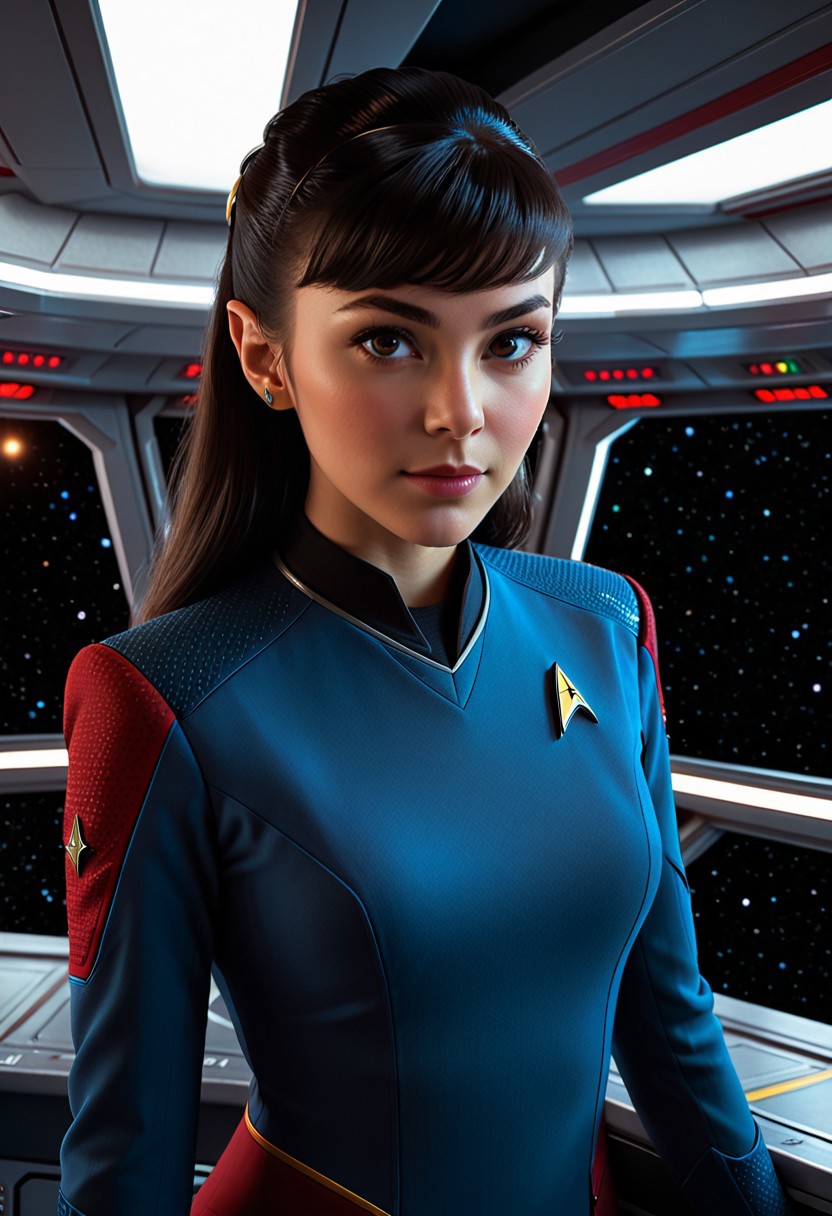 High resolution of ultra-realistic Beautiful young Vulcan science officer from the starship Enterprise, standing on the bridge of the starship, dressed in a red and blue Star Trek style Starfleet uniform, fragile girl, pretty cute face, with black Vulcan-style hair, (pointed Vulcan ear: 1.5), realistic brown eyes, best quality, Asymmetrical Balance, a masterpiece, 8k resolution, dynamic lighting, elegant, masterful, intricate details, realistic, vibrant colors, trending on Artstation, hyper-detailed, hyper-realistic
